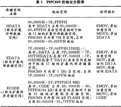 P89C669的存储器结构为哈佛结构,地址分配如表1所示: