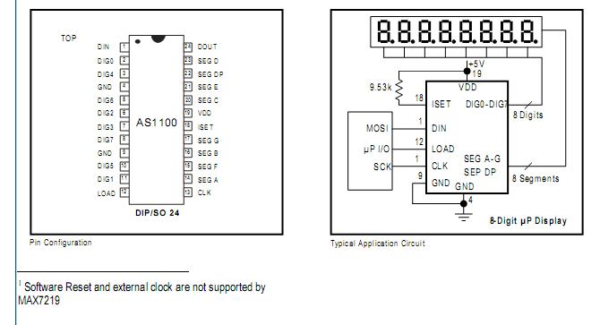 The AS1100 is an LED driver for 7 segment numeric displays of up to 8 digits. The AS1100 can be programmed via a conventional 4 wire serial interface. It includes a BCD code-B decoder, a multiplex scan circuitry, segment and display drivers and a 64 Bit memory. The memory is used to store the LED settings, so that continuos reprogramming is not necessary. Every individual segment can be addressed and updated separately. Only one external resistor is required to set the current through the LED display. Brightness can be controlled either in an analog or digital way. The user can choose the internal code-B decoder to display numeric digits or to address each segment directly. The AS1100 features an extremely low shutdown current of only 20µA. and an operational current of less than 500µA. The number of visible digits can be programmed as well. The AS1100 can be reset by software and an external clock can be used. Several test modes support easy debugging. The AS1100 is fully compatible to the MAX 7219. AS1100 is offered in a 24 pins PDIP and SOIC package.