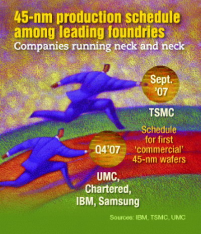 在45纳米工芝技术研发中,颇受业界关注的是特许、IBM、英飞凌和三星的联盟。它们将以低功耗工艺技术为基础,联手开发第一款45纳米的下一代通讯系统芯片。这款芯片的分工由IBM位于纽约的EastFishkill300厂生产;其标准库单元模组和I/O单元均由英飞凌提供。由于采用的是平台设计,该45纳米工艺在四家公司都可相容。并预期在07年底,可以在特许、IBM和三星的晶圆厂中同时通过认证。