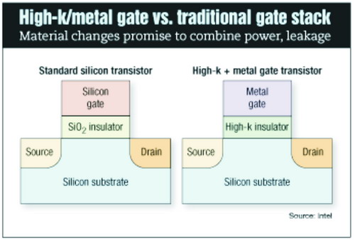 Intel共同创始人Gordon Moore说,采用“high-k”和金属栅电极材料,标志着从推出多晶硅栅MOS晶体管以来,晶体管技术的一个最大的突破,具有里程碑作用。高k及金属栅结构与传统的晶体管栅结构比较如图1所示。
