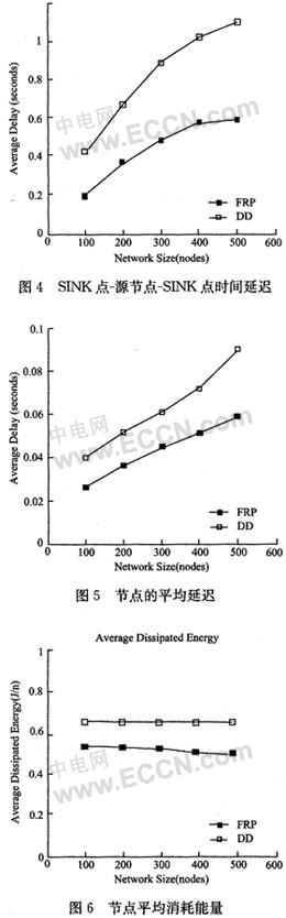 SINK点-源节点-SINK点的时间延迟指的是从SINK点发出查询信息,到数据返回到SINK点所消耗的时间。低的延迟时间可以保证用户有更充足的时间来处理突发事件。FRP主要通过SINK点发布任务查询命令建立路径,源节点沿着该路径反方向将数据传输给SINK点。而DD协议则是通过SINK点发布兴趣给网络,当源节点收到后,源节点通过多个路径传送数据给SINK点,SINK点收到后,并从中选择更快捷的路径加强,进行数据传输。FRP比DD协议在步骤上更简洁,从而获得更低的延迟效果。其仿真数据如图4所示: