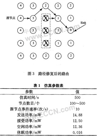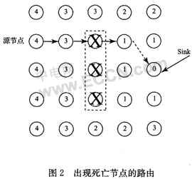 本文中的节点传输路径是唯一的,这样可以节约能量,提高效率。但是由于这种唯一性,如果一个节点电池耗尽或者物理损害而失效,则会导致其下级节点也脱离了网络。目前有些无线传感器路由协议针对这一问题,采用通过由SINK点发起洪泛协议进行路径修复的办法来解决,但是这样明显浪费能量,而且在洪泛期间,失效节点的邻节点若产生事件将无法传递,导致了数据丢失。
