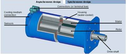 该型电机分为异步和同步设计,采用在定子外壳设计的水冷层来实现水冷,进水口和出水口设计在电机的后端,流经整个电机机身后经另一个出口出水。