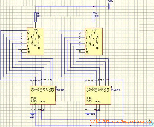 本设计采用51单片机AT89C51(晶振频率为12MHZ)对四相六线制步进电机(内阻33欧,步进1.8度,额定电压12V)进行控制。通过I/O口输出的具有时序的方波作为步进电机的控制信号,信号经过芯片ULN2003驱动步进电机。ULN2003 是高耐压、大电流达林顿陈列,由七个硅NPN 达林顿管组成。ULN2003 的每一对达林顿都串联一个2.7K 的基极电阻,在5V 的工作电压下它能与TTL 和CMOS 电路直接相连,可以直接处理原先需要标准逻辑缓冲器来处理的数据。ULN2003 工作电压高,工作电流大,灌电流可达500mA,并且能够在关态时承受50V 的电压,输出还可以在高负载电流并行运行。通过ULN2003构成步进电机的驱动电路,电路图如图1所示。51的25-28口接ULN2003的1-4输入端。另外,用键盘来对电机的状态进行控制,并用数码管显示电机的转速,采用74LS164作为2位单个数码管的显示驱动。74LS164带锁存,使用串行接法可以节约I/O口资源。其电路图如图2所示。通过51的TXD和RXD口对CLK和DATA发送数据。