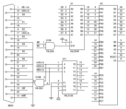 尽管所有的打印机口均有17根信号传输线,然而这些信号线的性能确存在着差别,例如输出电阻、抗干扰能力等都有所不同。IEEE488描述了两个级别的打印机性能标准:一级和二级。二级标准可以提供比原始打印口或一级标准大的多的电流。EPP和ECP模式均可以提供二级标准。电路设计中采用8D双向总线发送/接收器74LS245作为驱动电路,74LS245在电路中起缓冲、隔离作用,还有一定的保护和控制作用。当E有效时,74LS245的输入/输出方向由DIR控制。因此,若将DIR接固定TTL电平,则74LS245为单向缓冲器。一般都是使用它的双向传输功能。为此,DIR必须可控,使其根据需要变为高电平或低电平,并与E相结合控制数据传输方向。