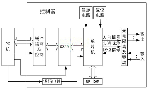 步进电机控制器是步进电机控制系统重要部分,控制器接收上位机发送的指令,并根据指令向各步进电机发出控制信号,各个电机的驱动器则将控制信号转变成直接驱动步进电机的电信号,实现步进电机的控制。采用PC机的控制系统,其软硬件资源丰富,柔性极强。图1为控制器总体结构图。