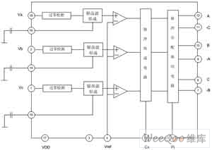 触发芯片选择高性能晶闸管三相移相触发集成电路TC787。TC787可单电源工作,亦可双电源工作,主要适用于三相晶闸管移相触发和三相功率晶体管脉宽调制电路,以构成多种交流调速和变流装置。TC787的内部结构如图4所示。