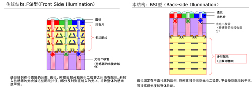 BSI技术将CMOS成像的灵敏度提升到了一个新的水平。透镜排列在传感器后方的硅衬底上,而不是前方,前方的配线会限制光的吸收。与东芝现有产品相比,这种定位方式下的感光度和光吸收量提高了40%,而且还能形成更细的像素。