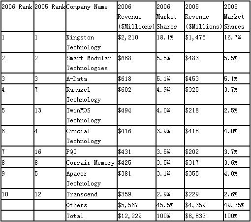 表2显示了iSuppli所做的2006年DRAM 模块市场制造商排名